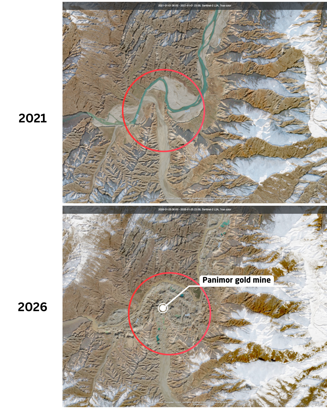 Pictured: Satellite imagery shows rerouting of the Panj river to Tajikistan in the Panimor gold mine since the extraction began. Coordinates: 37.531786, 70.157885