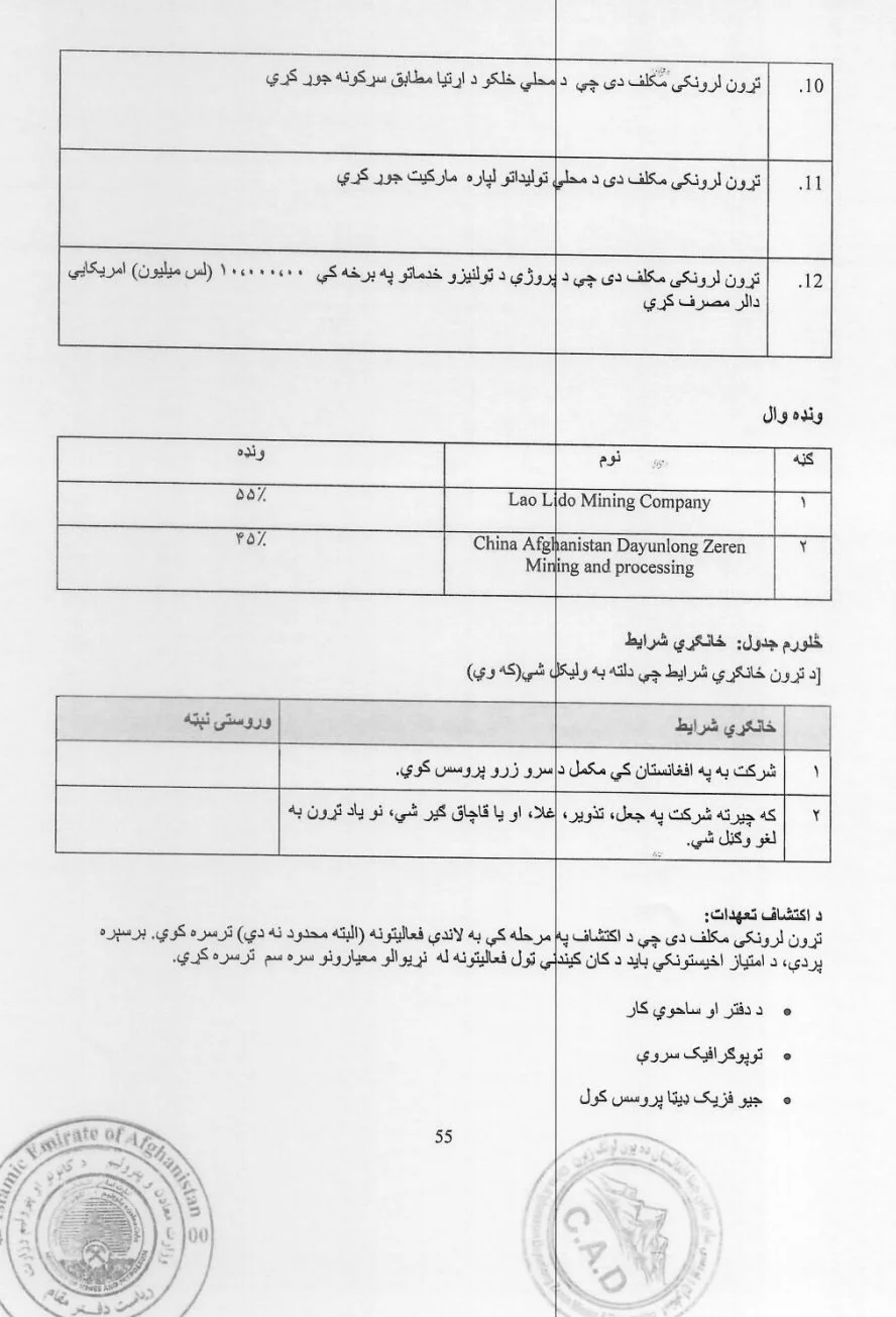 According to Ariana News and the DPMEA, the JV’s shareholder is the Zarawar Afghanistan Private Company, which also does not have a website or online presence, and is not listed on the contract. An entity called “Lao Lido Mining Company” is recorded under the “participants” section with CAD ZEREN, though, but does not appear elsewhere in the media or contract. While CAD ZEREN, the main contracting body, receives 45% of shares, Lao Lido Mining Company holds 55%. Based on their lack of history and what appears to be potential layered ownership, it is possible CAD ZEREN is a vehicle for the beneficiaries of the Zarawar Afghanistan Private Company and the Lao Lido Mining Company, which could be run by local entities, Chinese stakeholders or a mix of both.