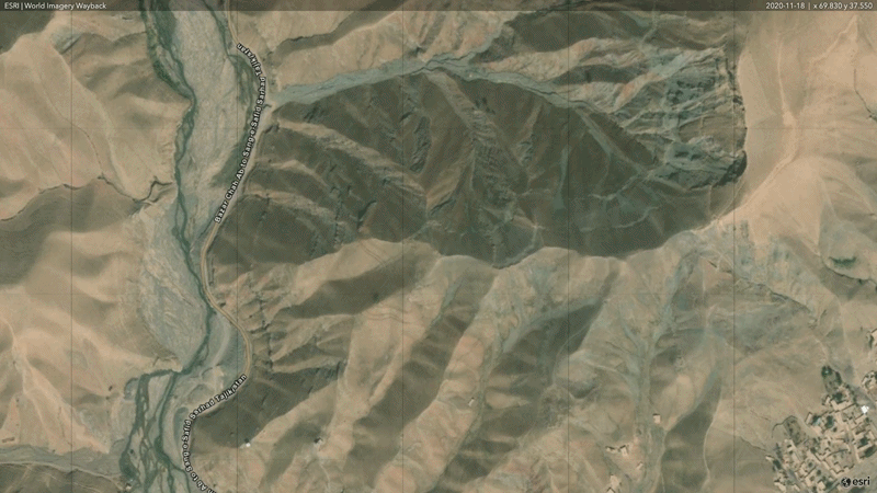 Pictured: Satellite imagery obtained from Esri indicates major changes to the Samti gold mine between 2020 and 2025. Coordinates: 37.549535, 69.829641